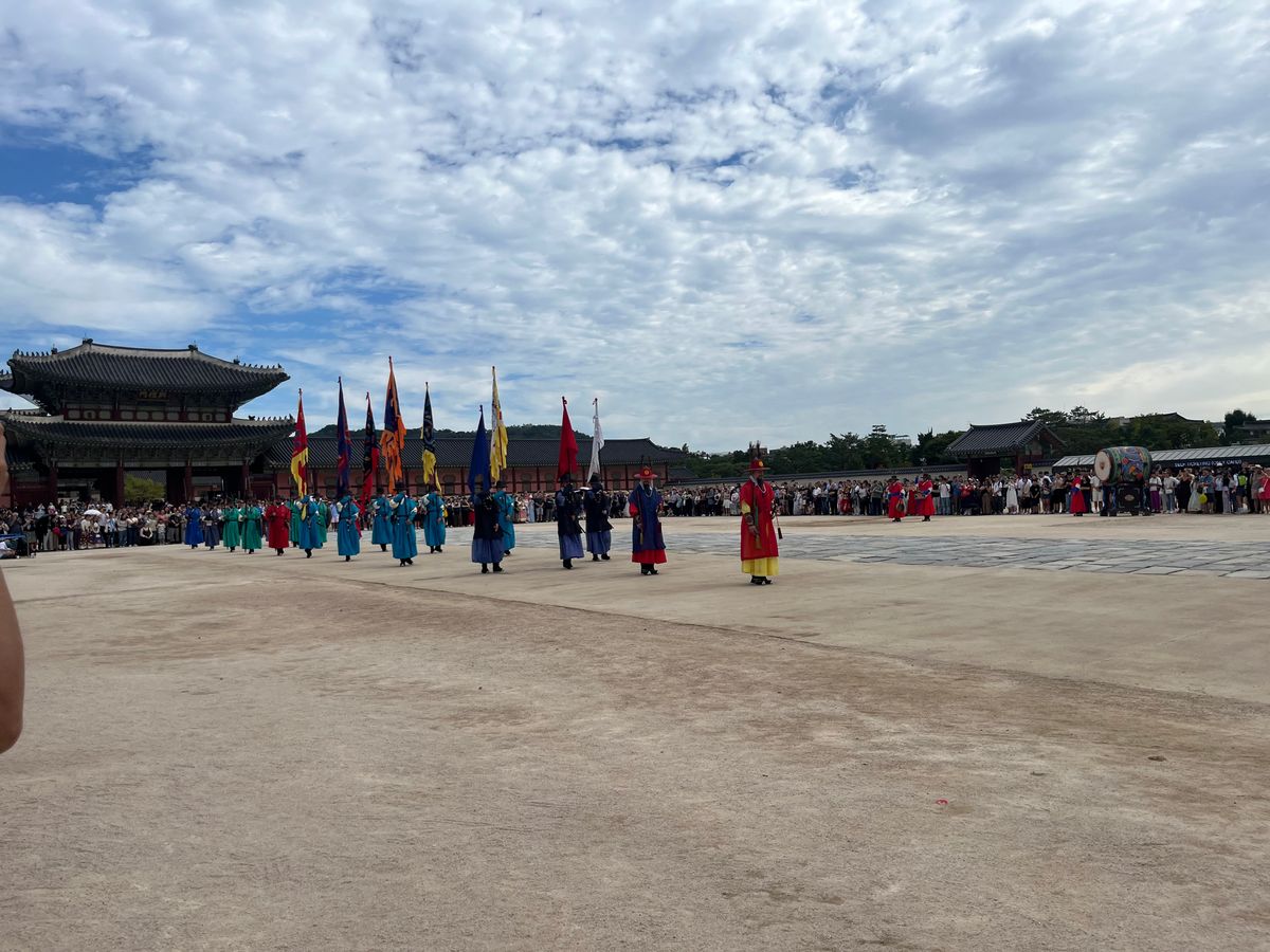 まずはチマチョゴリに着替えました。とても美しくてワクワクです。髪も可愛くセットしてもらいました。スムングンの交代式を見てる間も、自然の姿を写真に撮ってくださって、それもとても上手でびっくり🫢