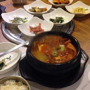 ・参加者は10名程で、まずは大きめのマイクロバスに乗り込み、明洞内の食堂へ。基本メニューの中から味噌チゲを選びました。食事はまだ先かと思い、その前におやつを食べ、お腹いっぱいでしたが、ちょっと辛めの味噌チゲは本当に美味しくて、ほとんど食べてしまいました◎