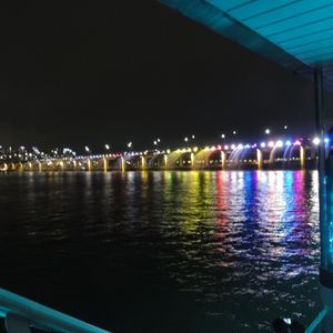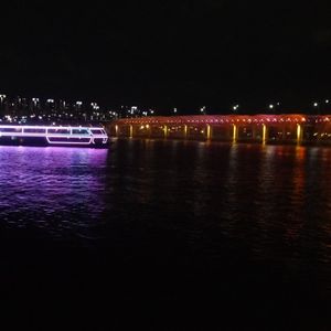 漢江ライブ遊覧船から見た盤浦大橋(バンポデギョ) の長さ1140メートルにも及ぶ月光レインボー噴水ショーは圧巻でした。
