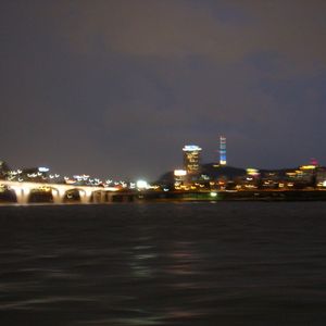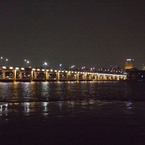 夜のハンガンよかったでーす。橋からの噴水と虹色の光がきれいだったし川に浮かぶ船のイルミネーションもすてきでした。ライブも歌がうまくって、わからない曲でも楽しめましたよ。南山タワーも待つことなくすぐ上がれたし最高でした。30秒でつくというエレベーターも上を見上げてたら空へすいこまれる感じ。泣いてた子供さんもあっという間に泣き止んでいました。素敵な仕掛けだなと思ってみていました。一度は夜にいかれるといいと思います。