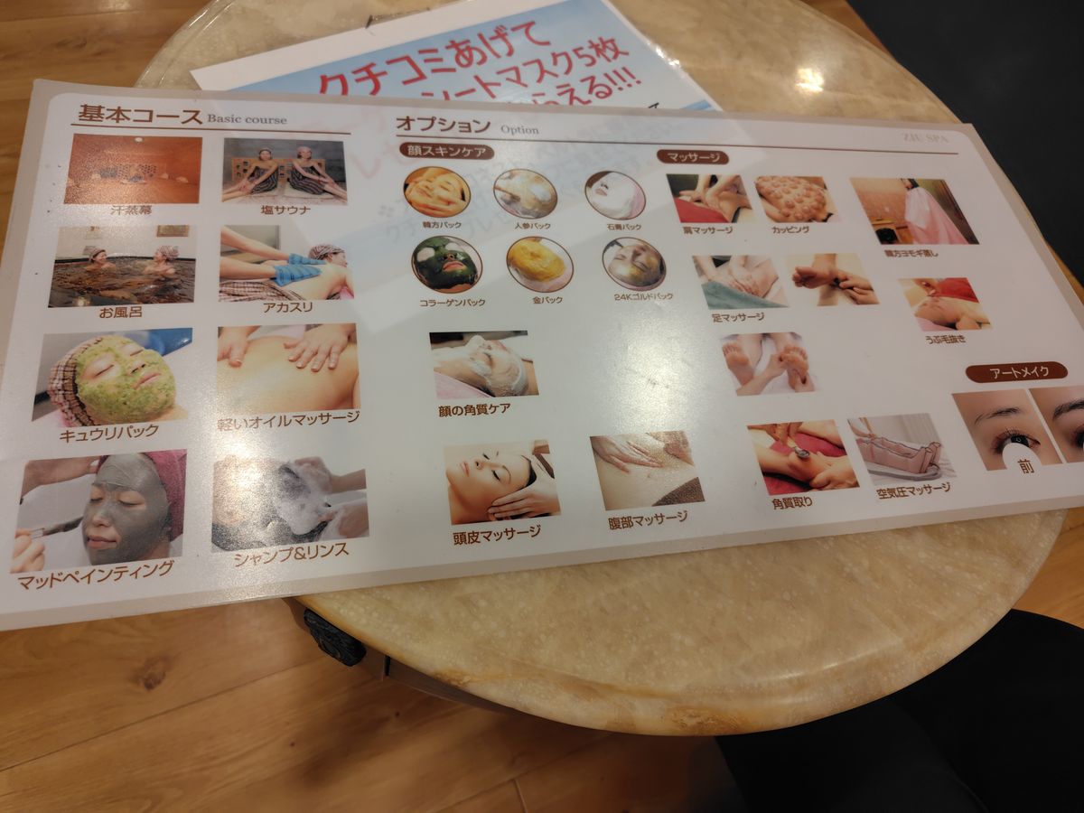 岩盤浴→よもぎ蒸し(女性限定オプション(無料))→お風呂→垢すり→顔パック→シャンプー・トリートメント