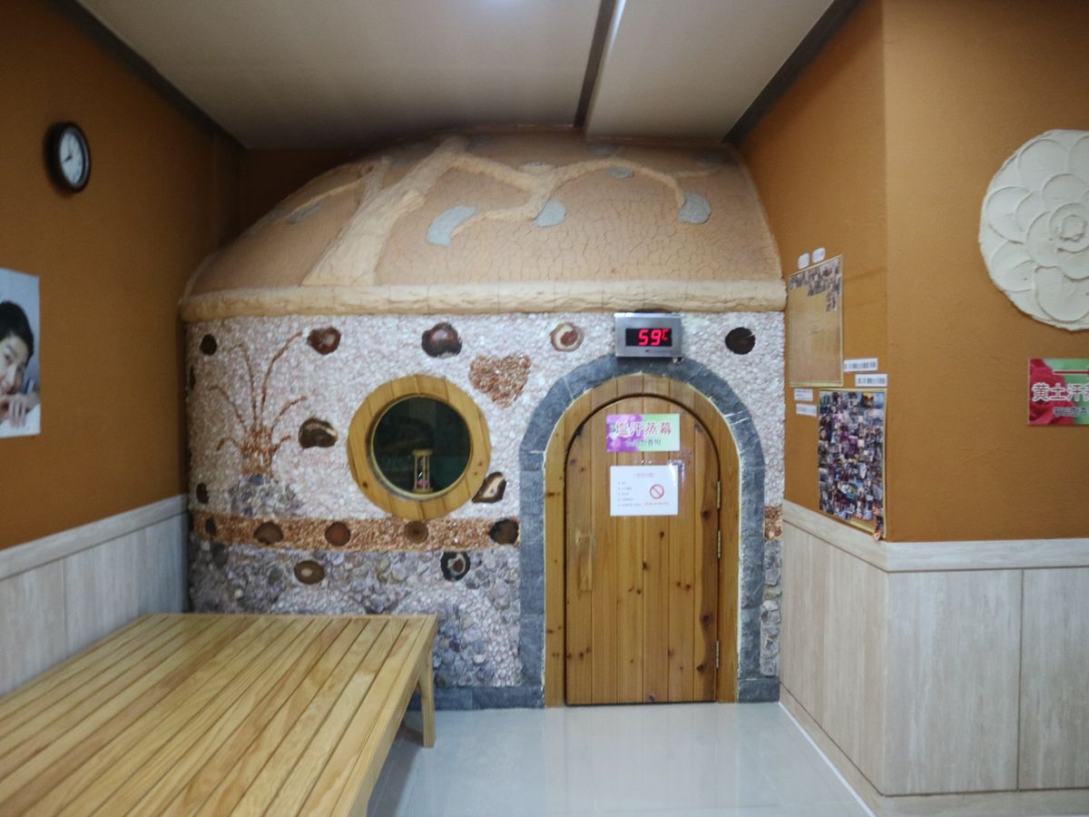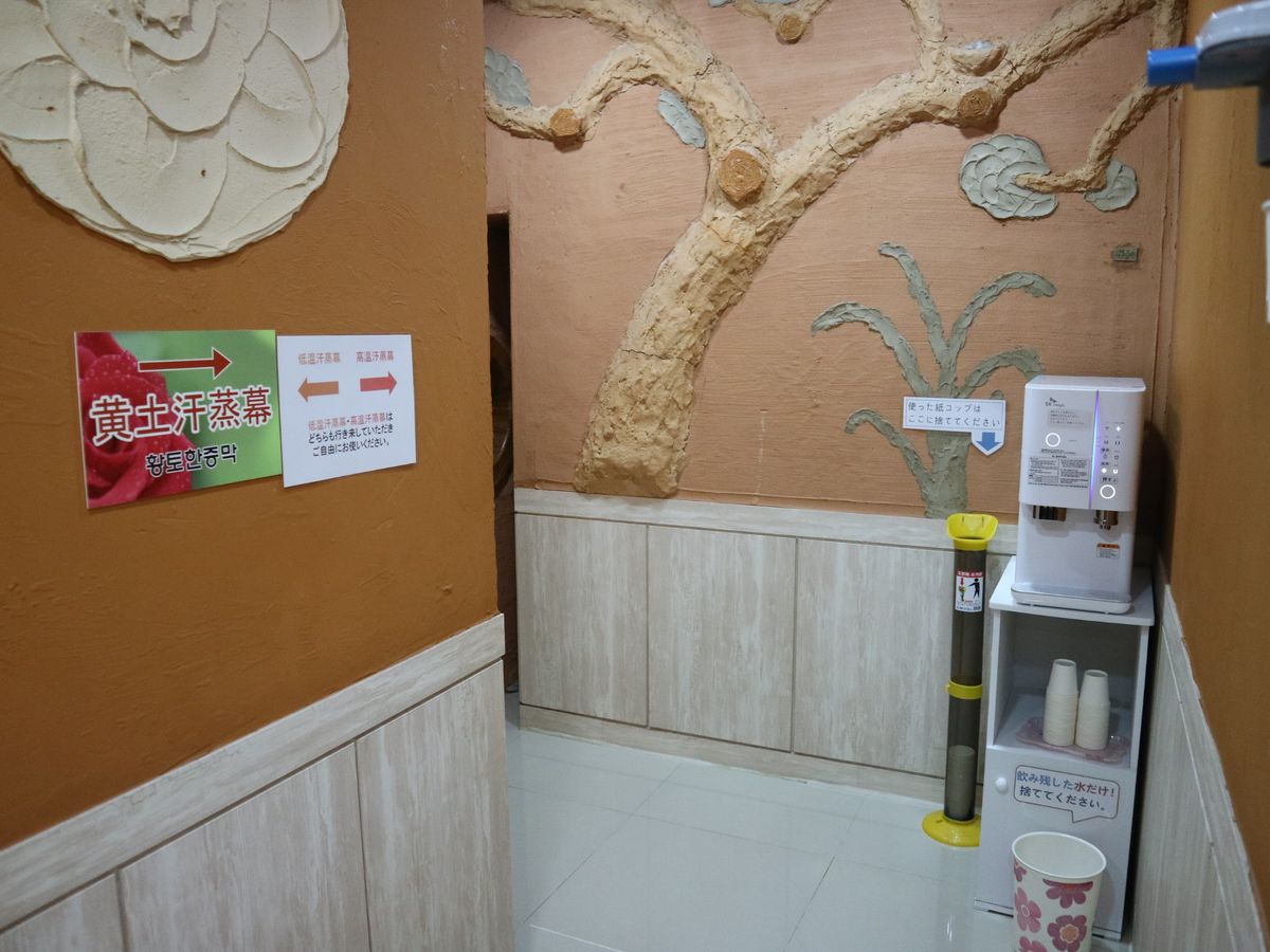 ③汗蒸幕(ハンジュンマク)は2部屋あります。夫婦で一緒に体験できます。まず、約90℃の黄土の部屋に入り、次に約70℃の岩塩の部屋に入ります。部屋の外には飲料水があります。