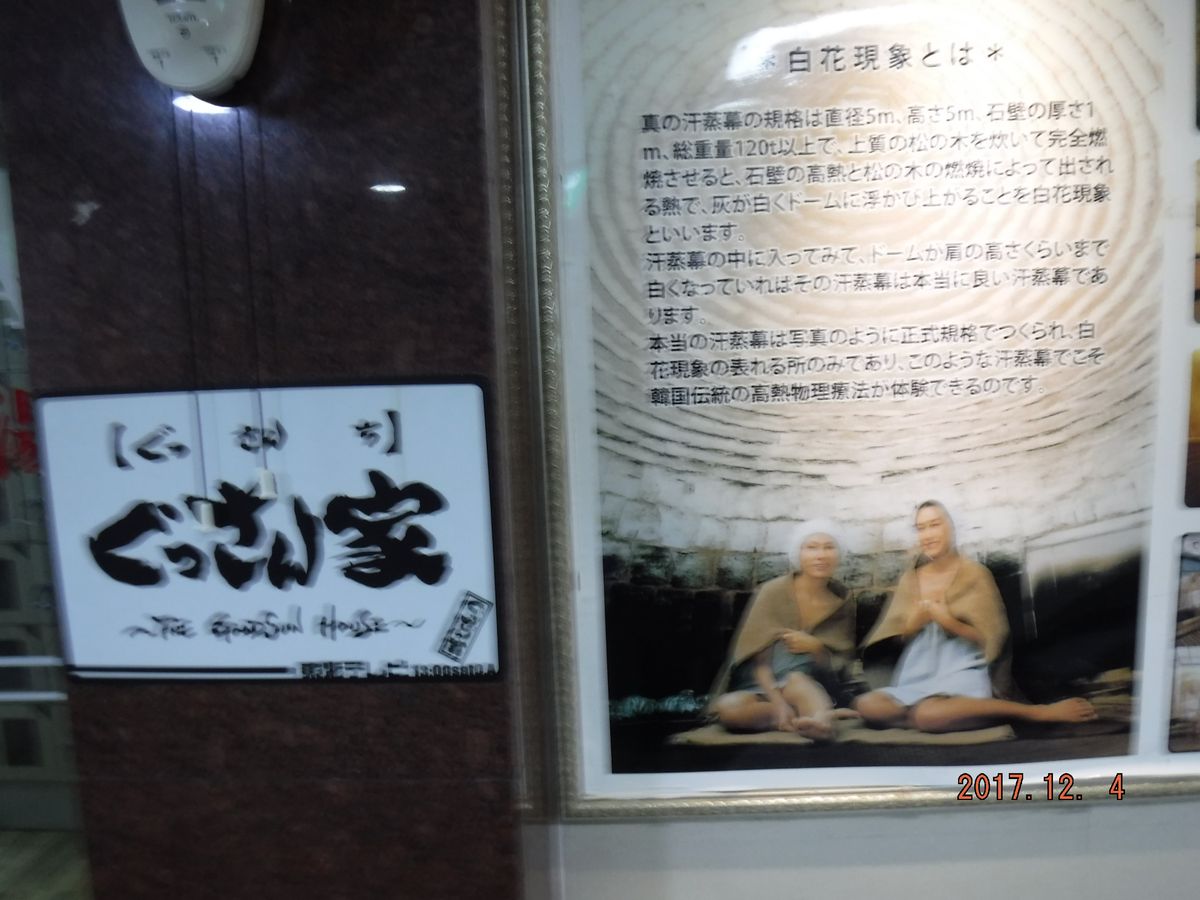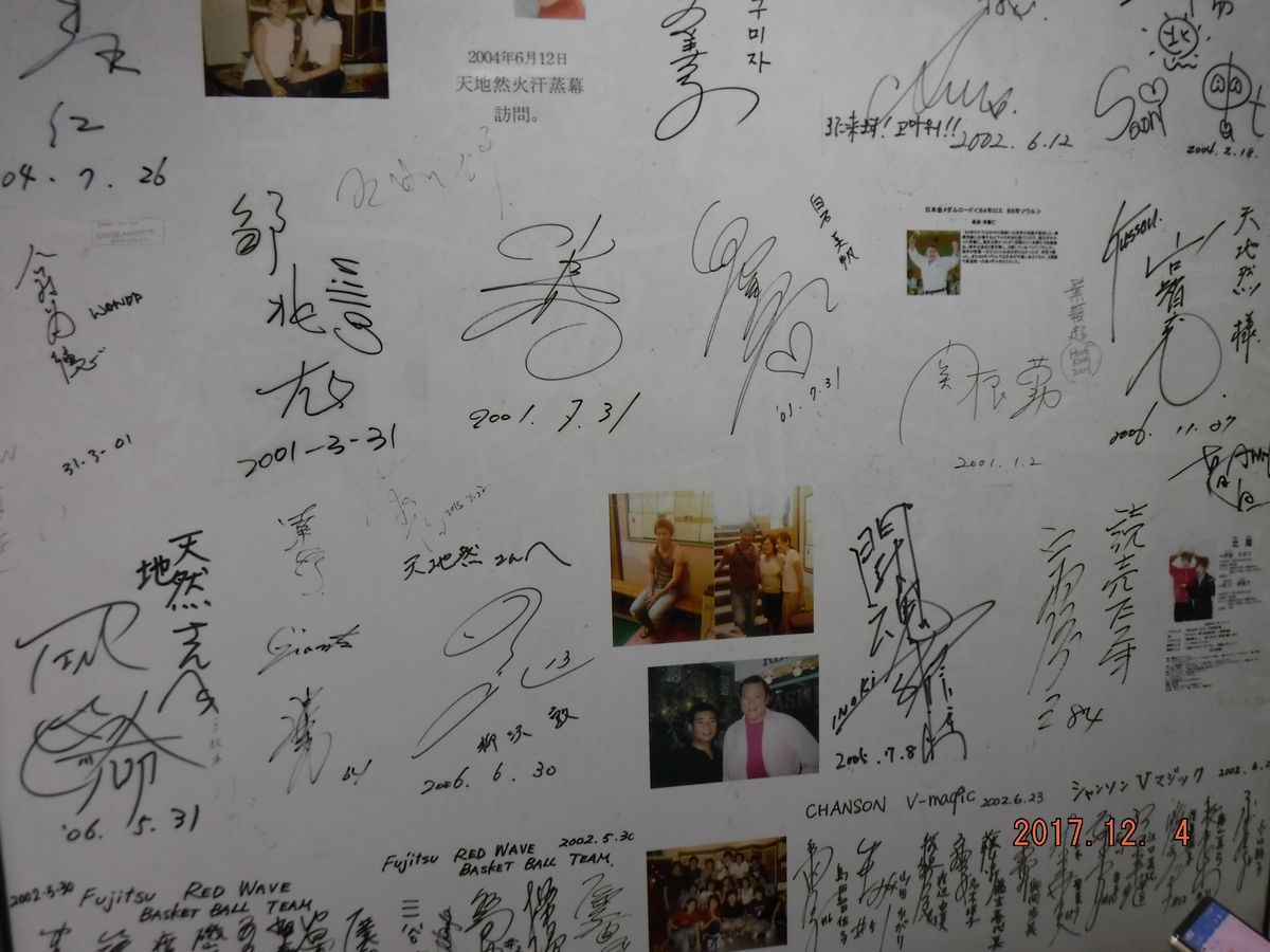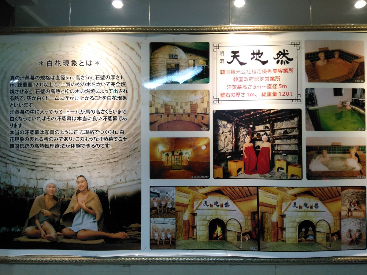 明洞のメインの通りって言うかいつも通る通りにあり、日本人になじみの温泉マークがすぐ見つかるのでとても分かりやすかったです。店は地下にあり階段を下りて行くと自動ドアの先に韓国や日本のスターや有名人のサインが写真入りで貼ってあり知ってる人もちらほらと見受けられました。「いらっしゃいませ」と出迎えられ、予約の名前を確認されまずは、オプションのコース説明をされましたが、日本語なので分かりやすかったけど、ここでは申し込みませんでした。基本コースということでお風呂に20分でサウナ、人参風呂、ゲルマニウム風呂、汗蒸幕と回って下さいと言われ温まりながらクルクルと回りましたが、汗蒸幕はあんまり熱くなかったです。もう時間かと思っていたら、まだ大丈夫ですと再度浸かって声が掛かるまで待って、その後アカスリと進みましたが恥ずかしいくらい垢が出ました。それから、オプションで2万ウオンかけて踵を削ってもらいつるつるになりました。