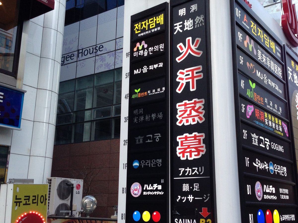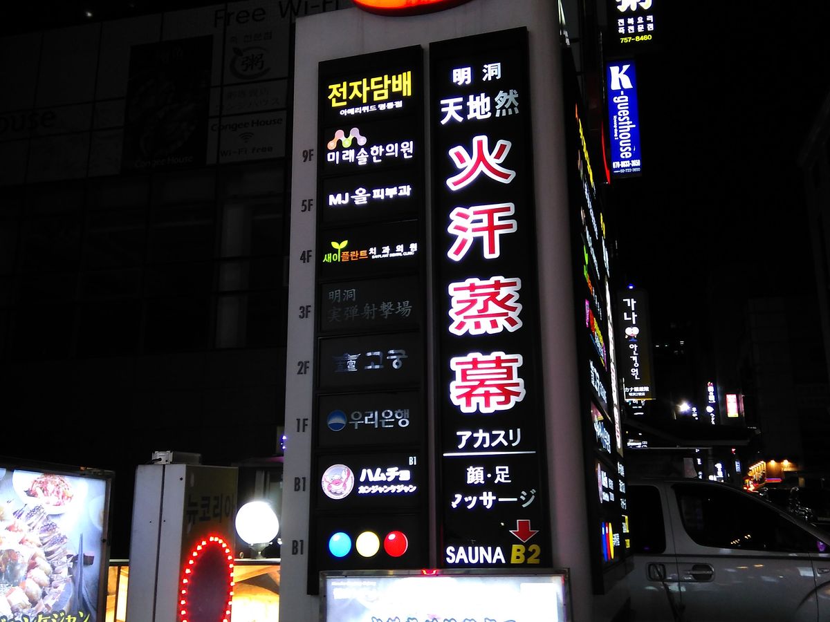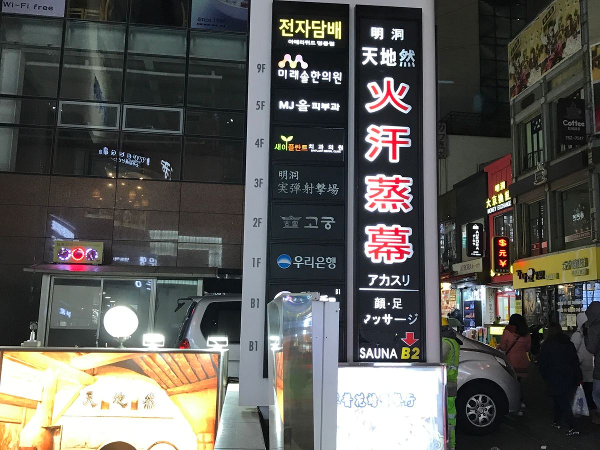 明洞のメインの通りって言うかいつも通る通りにあり、日本人になじみの温泉マークがすぐ見つかるのでとても分かりやすかったです。店は地下にあり階段を下りて行くと自動ドアの先に韓国や日本のスターや有名人のサインが写真入りで貼ってあり知ってる人もちらほらと見受けられました。「いらっしゃいませ」と出迎えられ、予約の名前を確認されまずは、オプションのコース説明をされましたが、日本語なので分かりやすかったけど、ここでは申し込みませんでした。基本コースということでお風呂に20分でサウナ、人参風呂、ゲルマニウム風呂、汗蒸幕と回って下さいと言われ温まりながらクルクルと回りましたが、汗蒸幕はあんまり熱くなかったです。もう時間かと思っていたら、まだ大丈夫ですと再度浸かって声が掛かるまで待って、その後アカスリと進みましたが恥ずかしいくらい垢が出ました。それから、オプションで2万ウオンかけて踵を削ってもらいつるつるになりました。