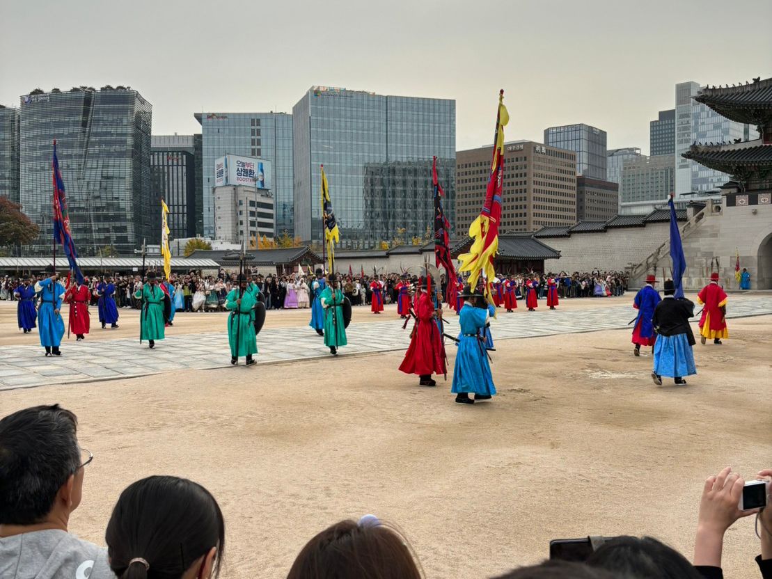 また、その後に行った、景福宮(キョンボックン)+守門将交代式も感動しました。ガイドさんから、見学するときチマチョゴリや韓服が着れるお店を紹介してくださって、だいたい3000円から着ることができ、種類も多いので見るだけでも楽しいですし、昔の王族になりきることもできて観光を堪能できました。たくさん歩きましたが、ホンさんにいろいろと説明や写真も撮ってもらってあっという間でした。交代式も、本場!という感じがして壮快でした。