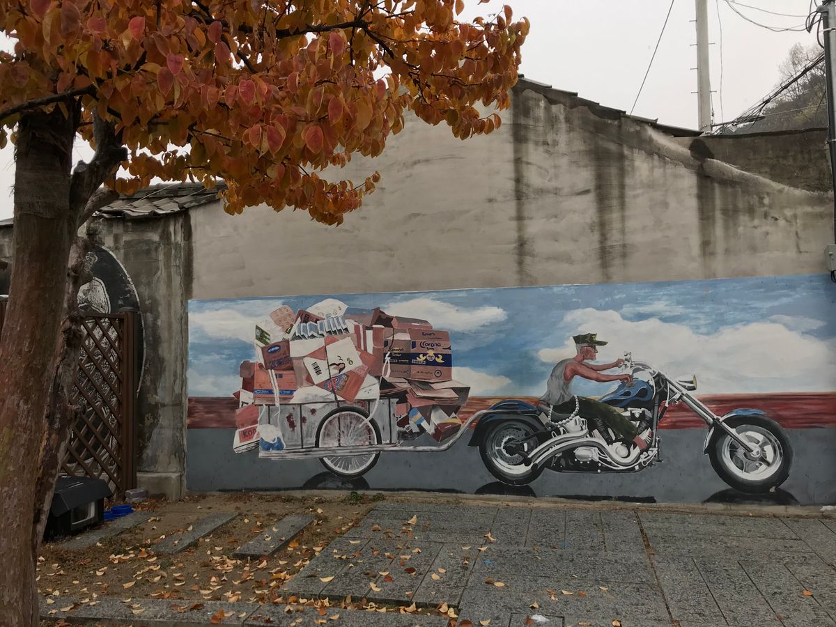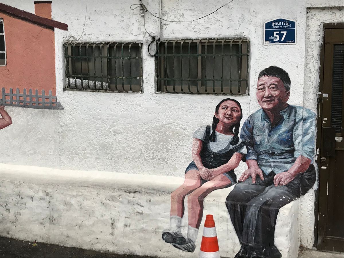 また、梨花壁画村では家の壁にいろんな絵が書かれており、大勢の観光客が一生懸命に記念撮影していました。ここの天使の羽根の壁画では、おじさんもつい童心にかえり主役になってしまいました。