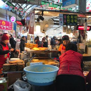 最後には市場にいき、まずは解散後の動きに合わせて市場から近い駅の場所と目的地の最寄り駅の名前(乗り換えが必要な場合はその駅名も)を丁寧に教えてくれました。その後、市場の中を簡単に案内してくれて、「ビビンバを食べるならこの屋台」「キンパを食べるならこの屋台」などとおすすめの店も教えてくれました。そして解散となります。