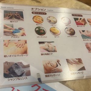 基本コースに顔スキンケアコラーゲンパックと肩マッサージ、足マッサージを追加してたっぷり最高のケアをしていただきました。とても明るい店長さんは経験豊富でこちらの肌の状態などを的確に判断してコースについてもアドバイスしてもらえます!お店も清潔でアカスリやよもぎ蒸しなどアカスリ以外のメニューも豊富で大満足で定期的に訪れたいお店です!