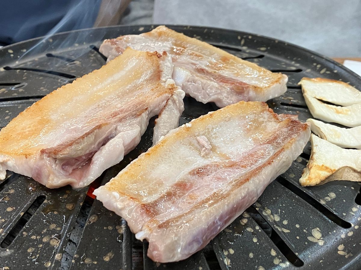 私はツアー後にサムギョプサルを食べる予定だったので、ガイドさんが特に推す昔ながらの炭火焼きレストランを予約してもらいました。明洞駅近くにあるそのレストランの凡その場所が分かる地図はもらいましたが、レストランの名前を聞いても答えてもらえず、場所の目安を聞かされ、予約したので行って下さいねと言われました。ツアー中にNAVERマップで検索しても該当する店の名前がヒットしないので、少し変だなと思っていましたが、何とかその店まで辿り着きました。辿り着いた店は、いかにも日本人観光客向けで、ニヤニヤしたレストラン店員に迎えられました。そして、すぐに最も高額な焼肉セットを勧められました。バカバカしいので断ったところ、店員のニヤニヤは一転、そっけなくなりました。私は英語を話しますが、最初、店員は英語でも日本語でもokと言っていましたが、その後の注文で日本語ではうまく意思疎通が取れず、英語で話すと、英語は分からないと強く言われ呆れました。そして出てきた料理は、これがガイドさん一押しの炭火焼きのサムギョプサルですかと驚くほどお粗末なものでした(サムギョプサル以外にも注文しました)。添付の写真が2人前で、確か約4万ウォンでした(全体的に高いです)。2人前なのに、肉のブロック数が奇数であることに笑いましたが、話が通じる相手ではない(言語的にではない)ので何も言いませんでした。