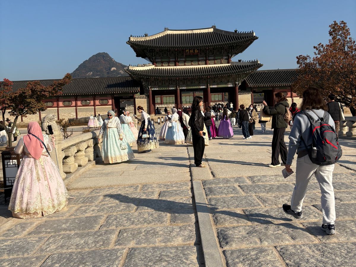 まずはチマチョゴリに着替えました。とても美しくてワクワクです。髪も可愛くセットしてもらいました。スムングンの交代式を見てる間も、自然の姿を写真に撮ってくださって、それもとても上手でびっくり🫢