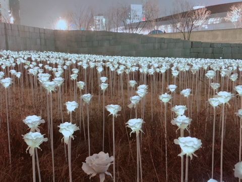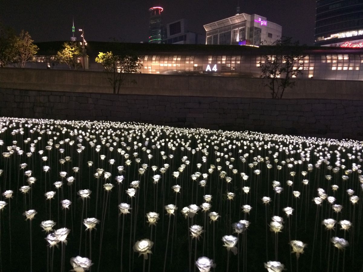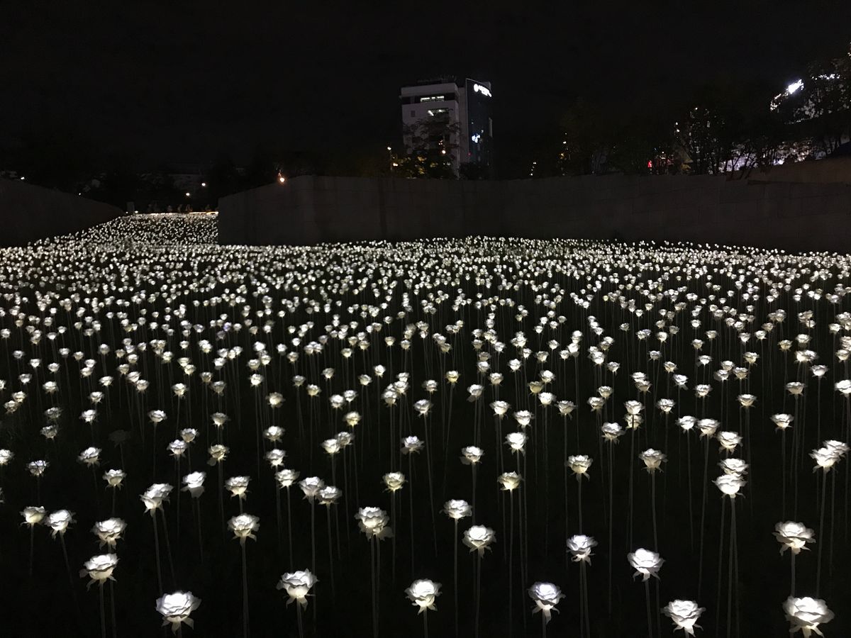 最後の東大門デザインプラザのLEDバラの花畑も綺麗な夜景写真を取る事が出来ます。