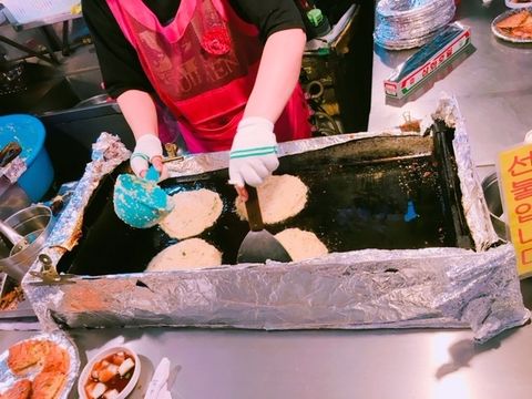 夕方集合のこのツアーに申し込んだおかげで、1日中有意義に過ごせました。夕食は広蔵市場でキンパやチヂミを屋台で食しました。チヂミは日本で馴染みがあるものより厚くて食べごたえ十分。その他にもユッケ通りなどガイドさんオススメを紹介してもらえました。