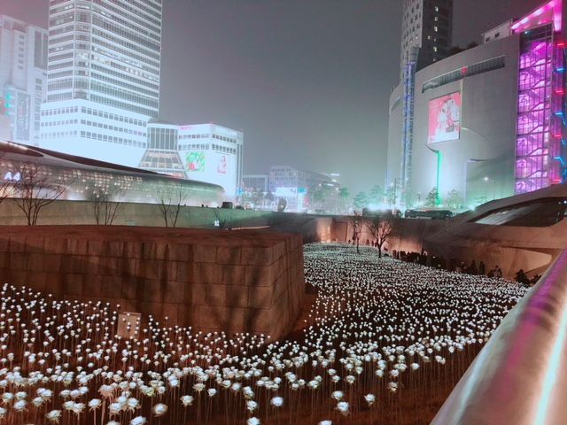 東大門(DDP):ザハさんがデザインしたDDPはぐるぐる建築の極みであり、お昼では味わえない夜ならではのLEDの薔薇畑まで案内して頂きフォトジェニックなスポットに行けました♪