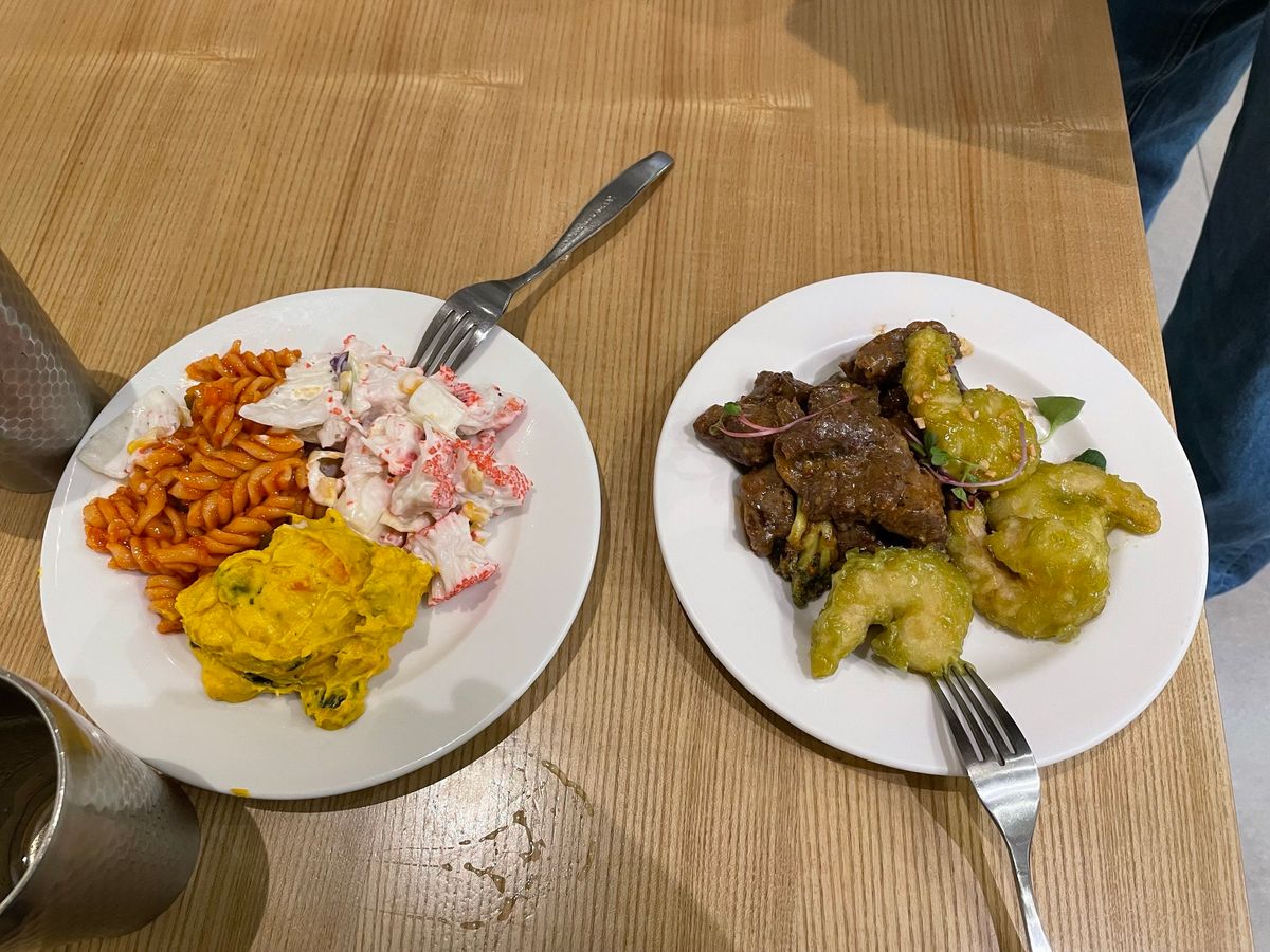 ビュッフェの食事は、温菜やサラダ、デザート、カップ麺など種類豊富でした。お酒はビール、ワイン、ソフトドリンク。思っていたより狭く、音楽が賑やかで、ゆったりくつろぐというよりはレストランにいるような感じでした。