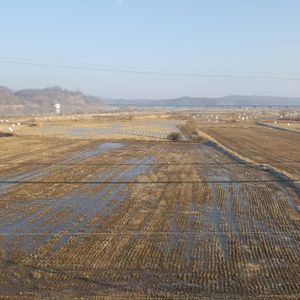 金浦近くの島から北朝鮮の穀倉地帯の歩く人、自転車に乗っている人を