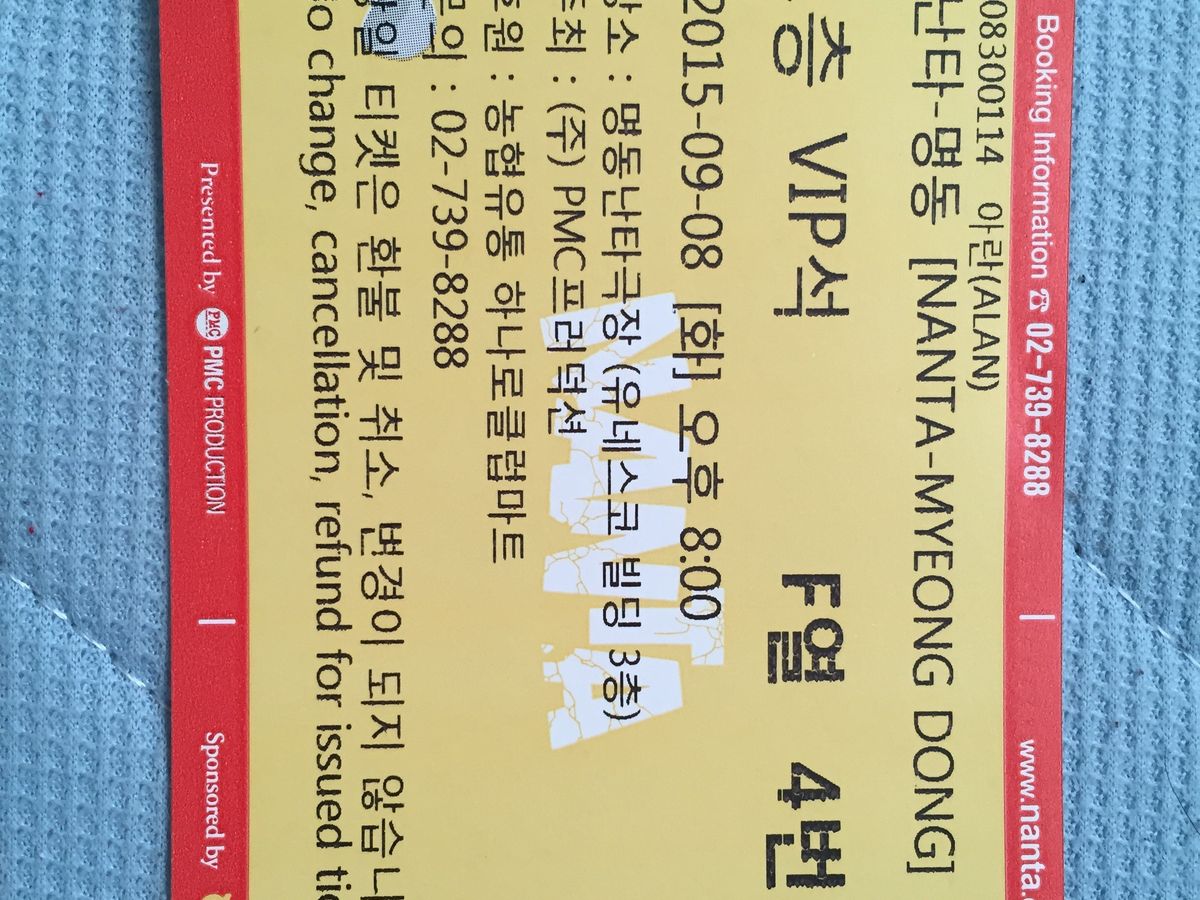 日本でチケットを予約しましたが、当日劇場に行くまで不安でした。明洞劇場へ集合時間30分前に着きましたが、発券して頂きました。結構前の席でした。