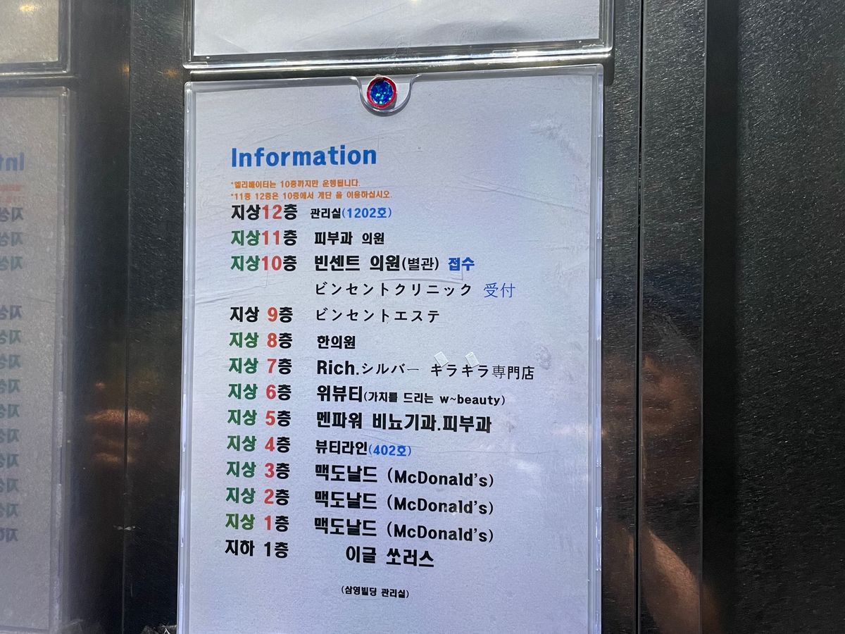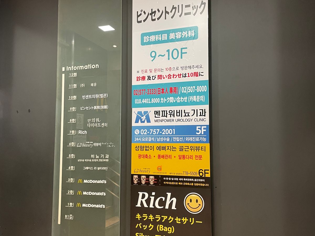 場所もわかりやすく明洞駅4番出口を上がった左前のマックが入ったビル、現在マックは改装工事中でしたがすぐにわかりました。受付が10階、免税手続きは9階でした。受付、診察、施術、全て日本語対応なので、細かな説明や対応ができて安心しました。待合室は日本人がほとんど、受診受付から施術終了までは1時間かからず、免税手続きも簡単でしたし、金額はどの予約方法をとっても変わらないので、ベルトラを通して予約しました。先生方も優しいかたばかりでした。是非また韓国へ行く時にはプランに取り入れたいと思います。
