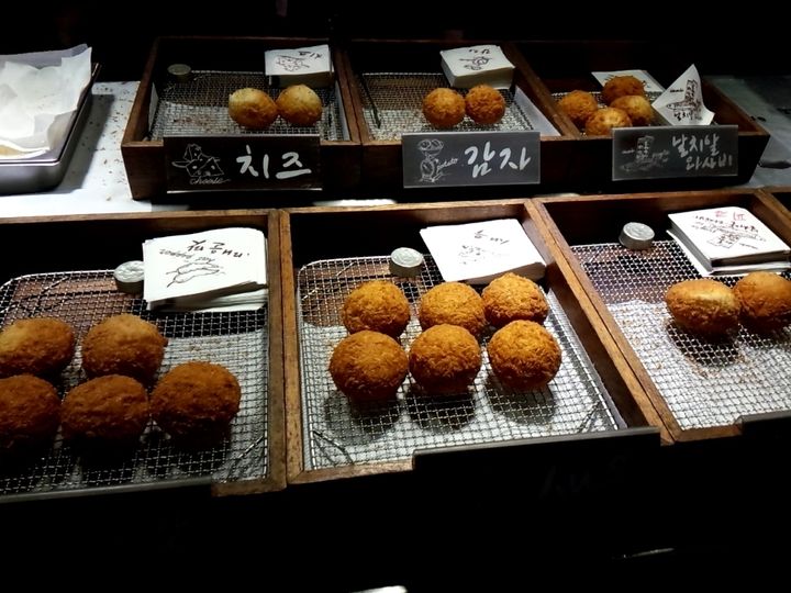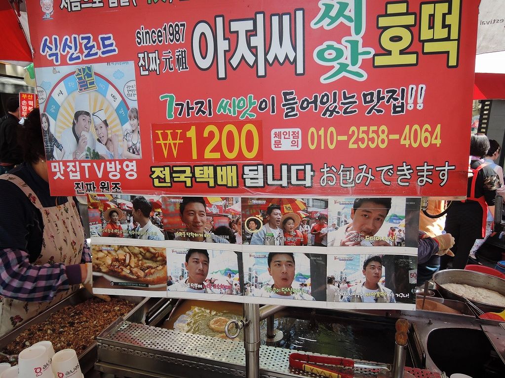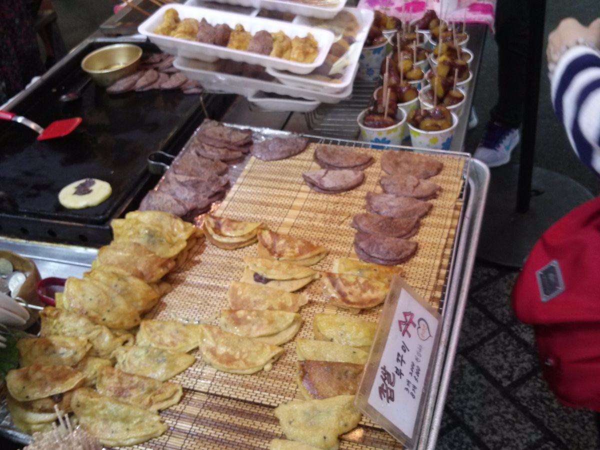市場散策では、おすすめのチヂミとおでんを食べたり、
