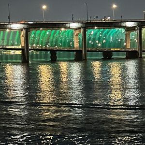 クルーズが始まって、しばらく夜景を眺めて、噴水ショーを橋の裏から見ました。その間、船は停止してくれて、しばらくショーをゆっくりと鑑賞出来て、とても綺麗で良かったです。その後、復路になり、しばらくして、演奏が始まりました。ギターの弾き語りでしたが、とても良い声で、癒されました。心地よい時間で、少し疲れもあったせいか、眠くなってしまいましたが、とてもゆったりした時間をすごせて、楽しかった。次回は、花火の打ち上げの方にも乗ってみたいです。