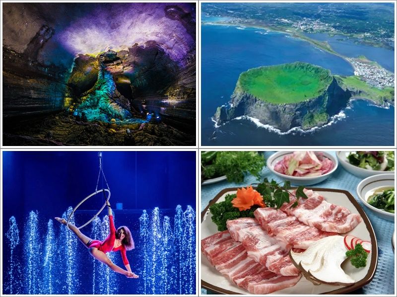 魅力あふれる火山の島「済州島」を1日で満喫出来るツアー!「城山日出峰(ソンサンイルチュルボン)」や「万丈窟(マンジャングル)」といった世界遺産と済州島の美しい景観を持つ観光地を巡った後は、水を使った舞台「スカイウォーターショー」を観覧。済州名物のランチ&ディナー付き!お昼には済州島産の海鮮物のだし汁に韓国風うどんを合わせた「海鮮カルクッス」を、そして夕食には済州産黒豚をご堪能いただきます。見て、回って、食べて、済州島を1日まるごと満喫できるツアーです。