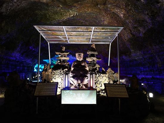 済州島観光ツアー 2大世界遺産巡り 城山日出峰+万丈窟(拒文オルム) スカイウォーターショー 海鮮カルグクス&黒豚の2食付き<1日/日本語ガイド/ホテル送迎付>