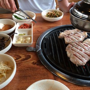 昼食は、チェジュ島でオススメの黒豚を頂きました。しかし1人では食べきれない量なので、ドライバーの秦さんにお付き合い願ったら、快くご一緒してくださいました。