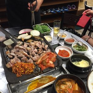 また、夕食は黒豚の焼肉とキムチチゲを注文していただきました。お肉は厚さがあり1人前300g位で2人前以上の注文となるので、日本人2人では量が多いようです。