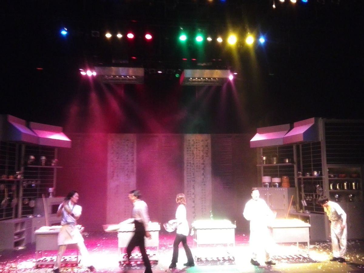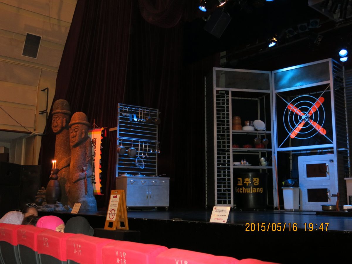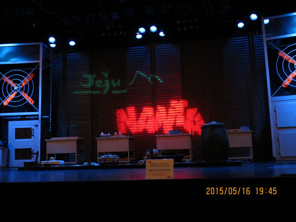 前に東京で見ましたが、内容は大体同じですがマネージャーが済州島のオレンジを被って出て来たのが面白かったです。舞台左にトルハルバンの像、右に水瓶を背負ったチマチョゴリの女性像があり済州島の雰囲気です。皆爆笑でしたが特に子供達が笑ってました。ドリフターズ、志村けんのコントの乗りです。日本人はあまり居なくて、主に中国人の方が多いです。