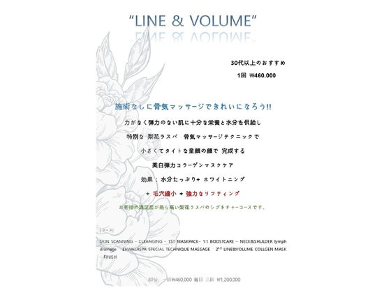 EHWA LA SPA独自の繊細なテクニックで顔の各部位にアプローチし、フェイスラインを整えるとともにリフティングにも効果があります。(※高濃度の製品を使用するため20代にはおすすめしません)