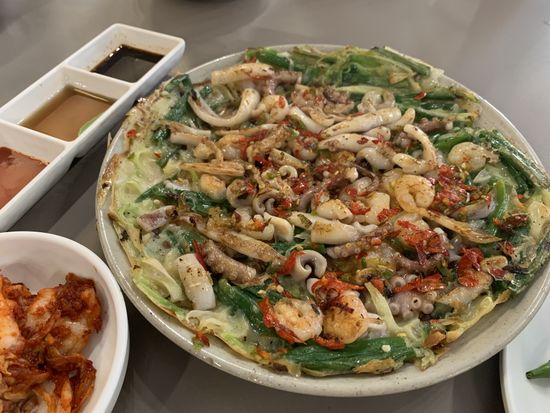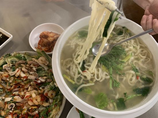 看板メニューのカルグクスの麺はもちもちで、スープには新鮮な貝の旨味が染み出しています!具材たっぷりの海鮮チヂミもお召し上がりください。