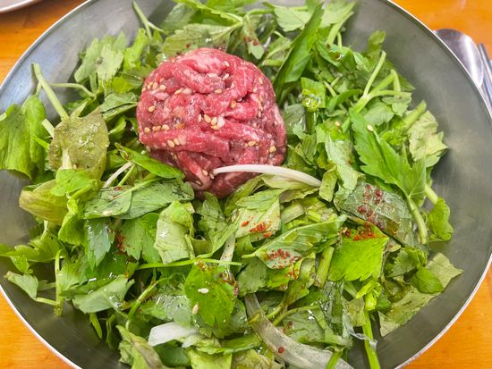 「ヌンドンミナリ」は、新鮮なセリ(ミナリ)を主役にしたソウルで大人気のミシュラン・ビブグルマン掲載店!爽やかな香りのセリを贅沢に使った「ミナリコムタン」や、醤油ベースの「ユッケビビンバ」が看板メニュー。SNSや現地の人にも人気で行列必至ですが、健康志向で彩り豊かな絶品料理が楽しめます。