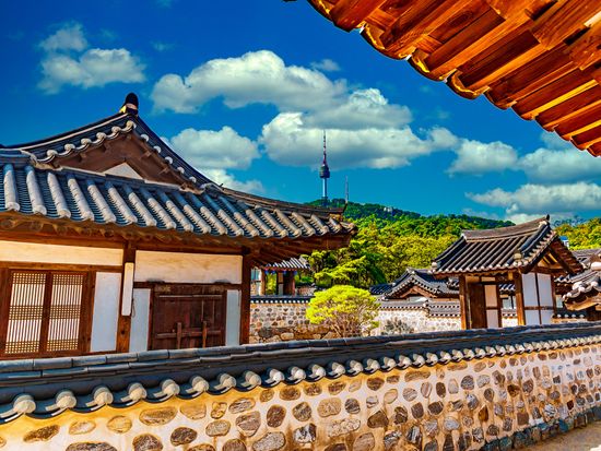 移転・復元された韓国の伝統家屋「韓屋(ハノク)」を見学できる南山韓屋村へ。朝鮮時代を思わせる景観が美しく、趣ある庭園も見どころです。韓国ドラマのロケ地としてもたびたび使用されているそう。