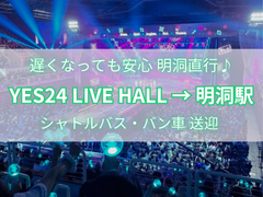 ライブ終了後、明洞まで直行移動!最近、人気アーティストのコンサートが数多く開かれるYES24ライブホールは、ソウルの端となる広津区に位置しており交通が不便です。コンサート終了は遅くなるのでホテルまでの帰りが心配。そんな方にピッタリな明洞直行シャトル送迎サービス。安心してライブを楽しむことが出来ます。ご予約はこちら。