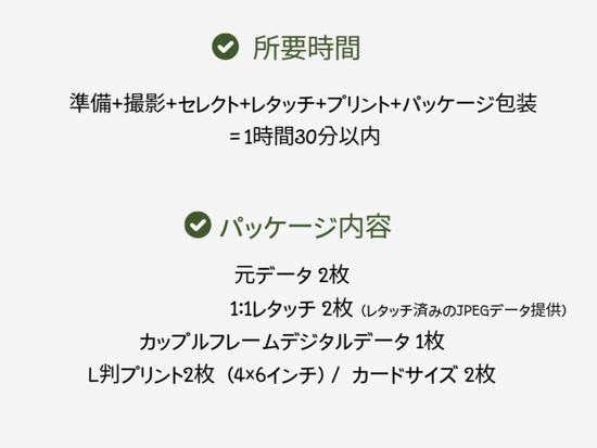 撮影後は当日にレタッチ済み2枚+元データ2枚をお渡しします。