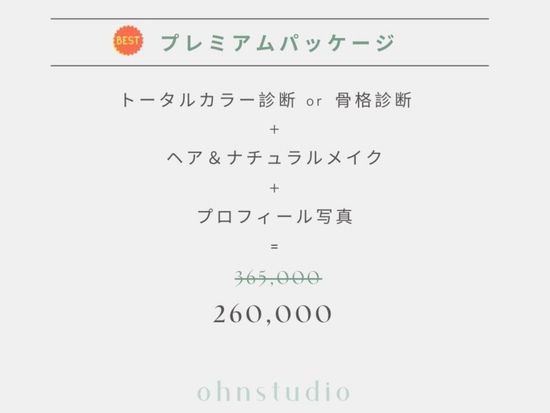 カラーフォト+ヘアメイク+パーソナルカラー診断または骨格診断(約3時間)