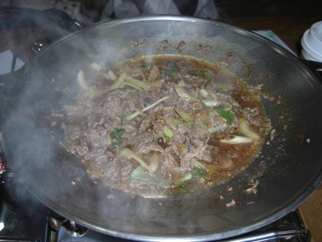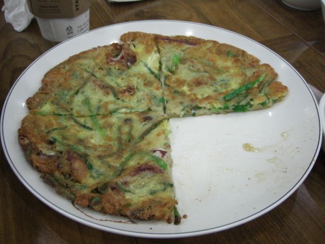 屋台体験:なにが食べたいか希望を聞かれ主人がチヂミが食べたいというと、混み合っている屋台をかき分け、座席を探してくれて、着席。待っていると緑豆チヂミを用意して頂き、焼き立てを美味しく頂きました。