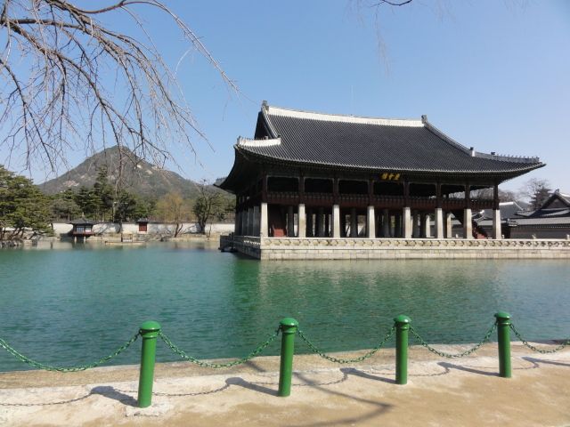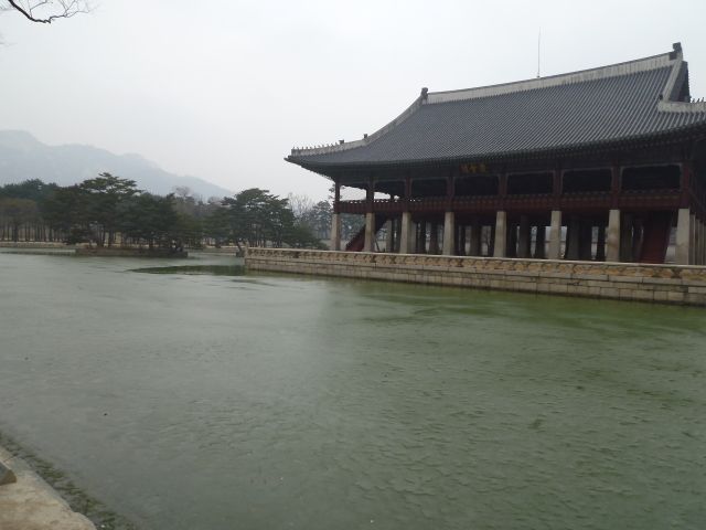 古宮まで車内では韓国の歴史やソウルの建物の説明などをガイドさんが話してくださいます。少し聞き取りにくい部分もありますが、とても勉強になりました。雨が降ってたので残念ながら車窓はあまり楽しめませんでしたが、古宮は風情があって素敵でした。宮前の池も深いエメラルドグリーンがにわか雨でしっとりしててうつくしかったです。