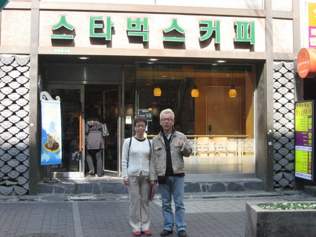 雨が降り少し肌寒い中、色々と観光さてもらい面白かったですよ。南大門では、我々夫婦だけになり目的のメガネも買うことが出来ました(少し予算オーバーでしたがネ!)すんなり買えることが出来ました。次の日の東大門での皮ジャンバーを買う所も教えていただきバッチリ値切って良い物を買えました!林さん有難う!!日本でのツアーも色々見ましたが時間も短く高いですね!!もっと夜の買い物ツアーもお願いすればよかったです。写真はガイドの林さんと嫁さん、そして仁寺洞通りの世界で唯一の地元の字でのスタバーです。