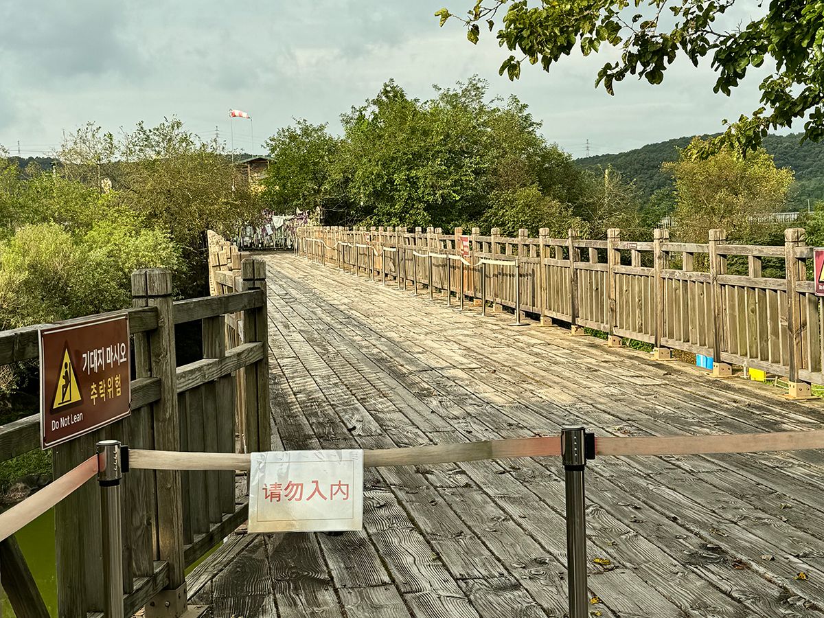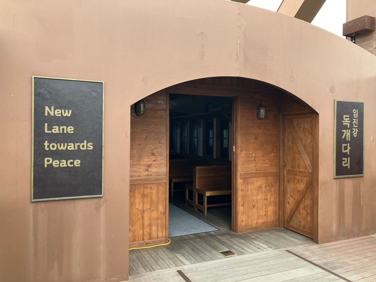 臨津閣でも戦争に関係する展示の説明をいただいた後自由時間がありました。橋の上のスカイウォークに行ったり、軽食を食べたりできます。お手洗いもあります。興味があれば北朝鮮のお札や切手を買えます。