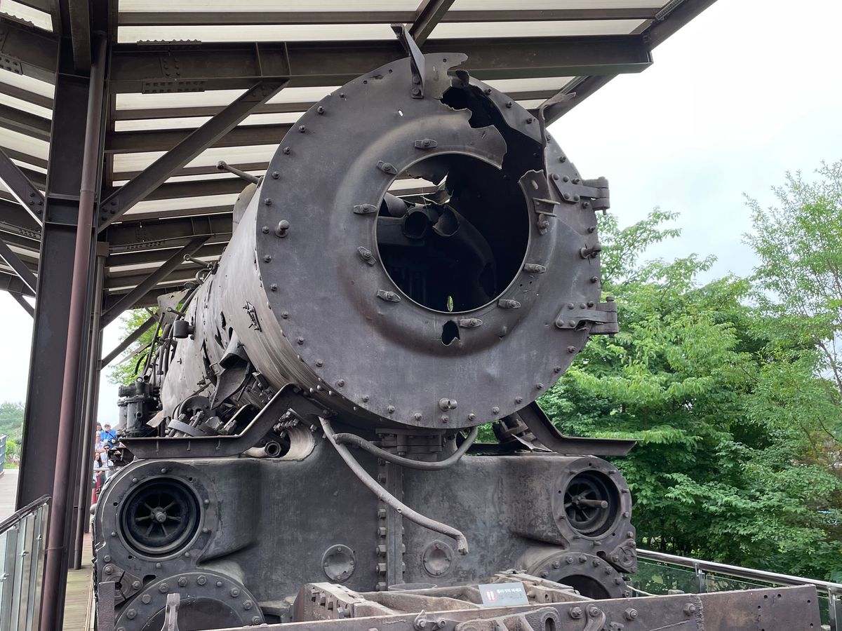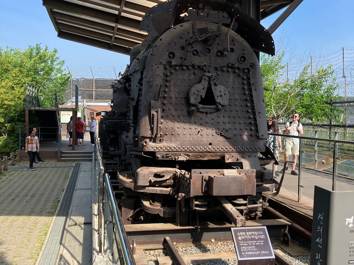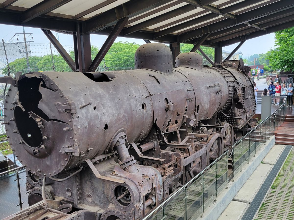 戦争中に銃撃を受けた電車、真ん中で崩れたままの橋、北朝鮮側から掘られたトンネルなど実際の歴史の痕跡に触れ、また厳誡警備の中でのツアーを通じて、かつて戦争がありそれがまだ続いていることを肌身に感じました。