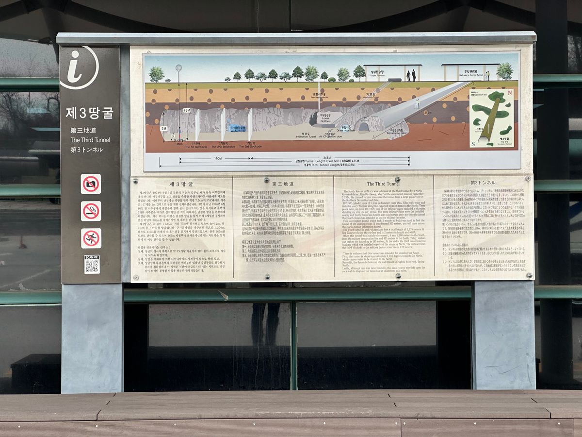 それ以上にガイドのホンさんがとても機転の利く方で、限られた時間の中で非非常に有意義な時間を過ごすことができました。当日はお天気も良く北朝鮮がとてもよく見えました。本当に色々なことを考えさせられました。第3トンネルについては、私は全くなんともなかったのですが、確かに長い坂道なのでしんどそうにしている方もちらほら見受けられました。途中2か所ほど休憩用の椅子がありました。個人的に、特産の高麗人参エキスはお勧めです。
