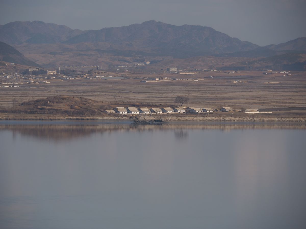 金浦近くの島から北朝鮮の穀倉地帯の歩く人、自転車に乗っている人を