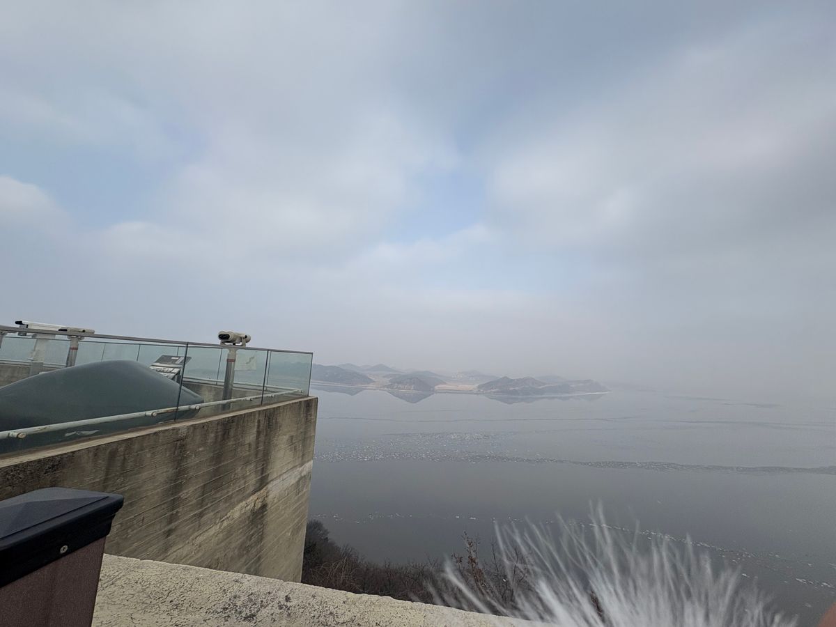 北朝鮮を間近で見られるスタバでは、コーヒーを飲みながら凍った川向こうの北朝鮮大地を見ると何だか感慨深く感じる時間でした。(写真撮影も可でした。)望遠鏡を覗くと見せる宣伝用に建れた青色住居(無人)や自転車に乗り行き来する人も見られました。