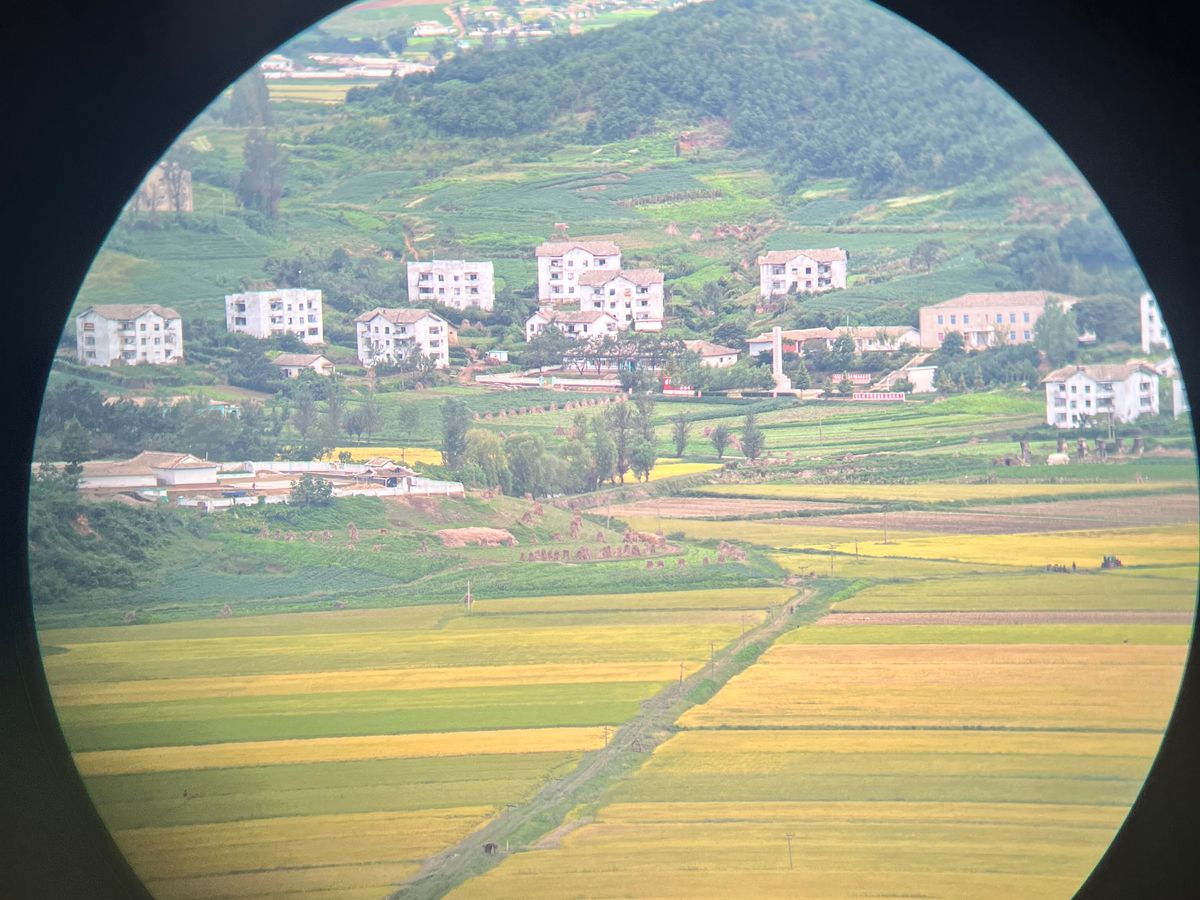 展望台では田畑の向こうに山々が見え、双眼鏡で見るとバイクや徒歩の北朝鮮の人達を見ることができました。