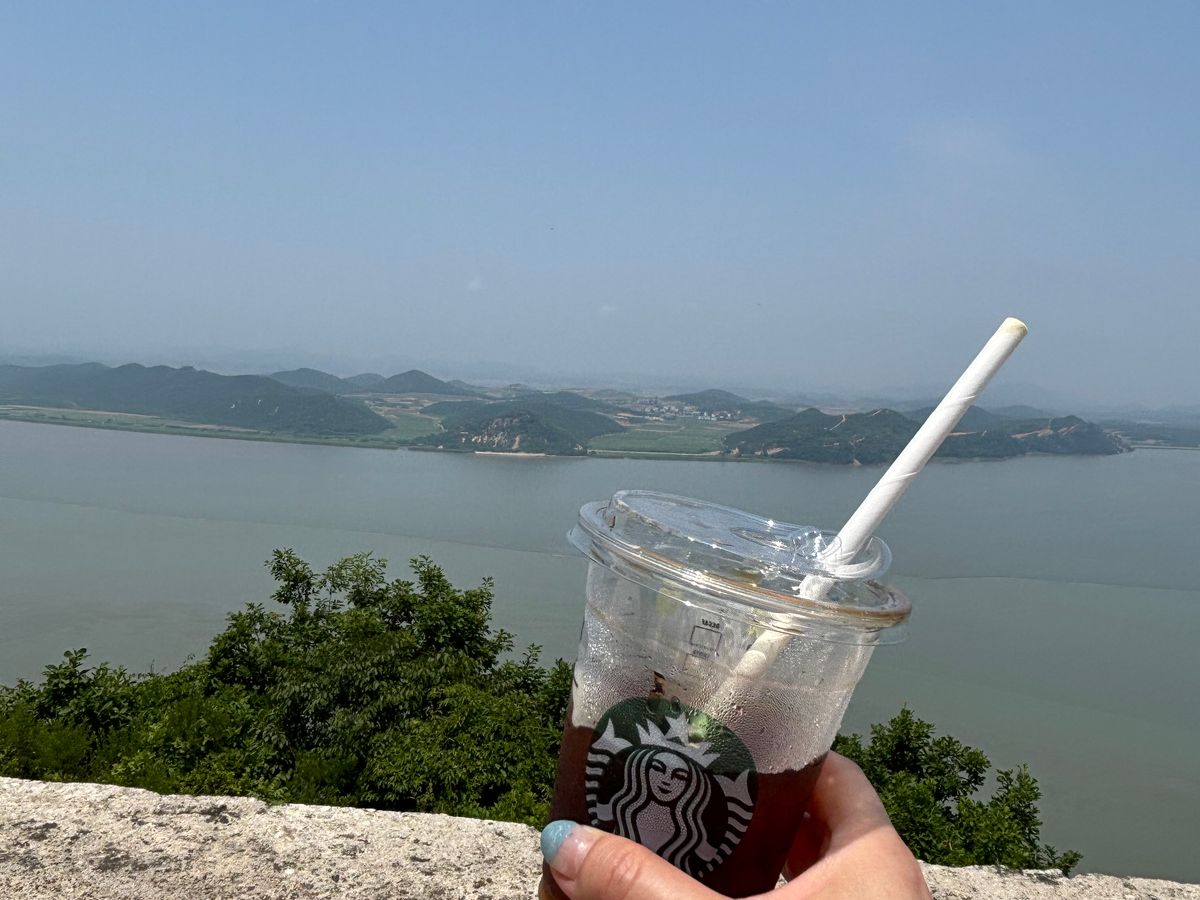 雨風の中スタバに着いた時には奇跡的に雲がとれて1.4キロ先の北朝鮮がみえました。なかなか行くことのできないスタバに行くことができて貴重な体験でした。