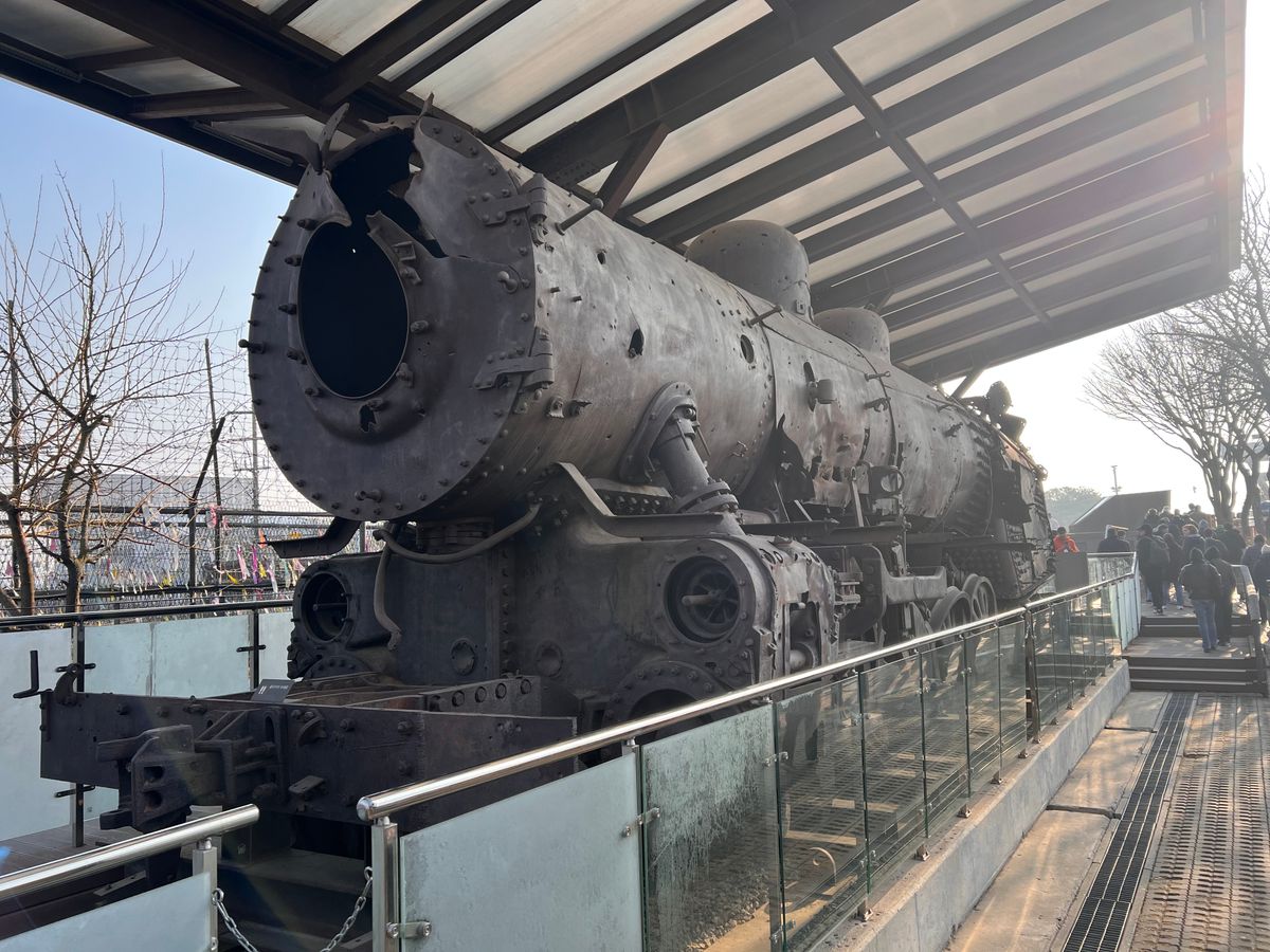 1時間ほど走り、平和記念総合センター周辺へ。統一大橋、平和の鐘、自由の橋、そして破壊された蒸気機関車や慰安婦像など、各スポットで丁寧な解説を受けました。