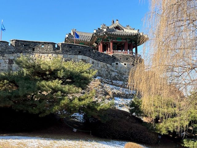 12月22日は本当に寒い日で、気温が-11度。水原華城の伝統武芸は中止、華城列車は運休でした。でも、ガイドのイさんが、寒い中、城内を丁寧に案内してくださいました。知識も豊富で、お話の内容もわかりやすく、聞いていてとても楽しかったです。私たち以外に見学者もおらず、貸し切り状態でゆったり見学できました。(とても寒かったですが…)時間が余ったので市場を案内していただきました。たくさんの食材があり、活気があって楽しい場所でした。ドラマのロケ地も車で回って案内してもらいました。