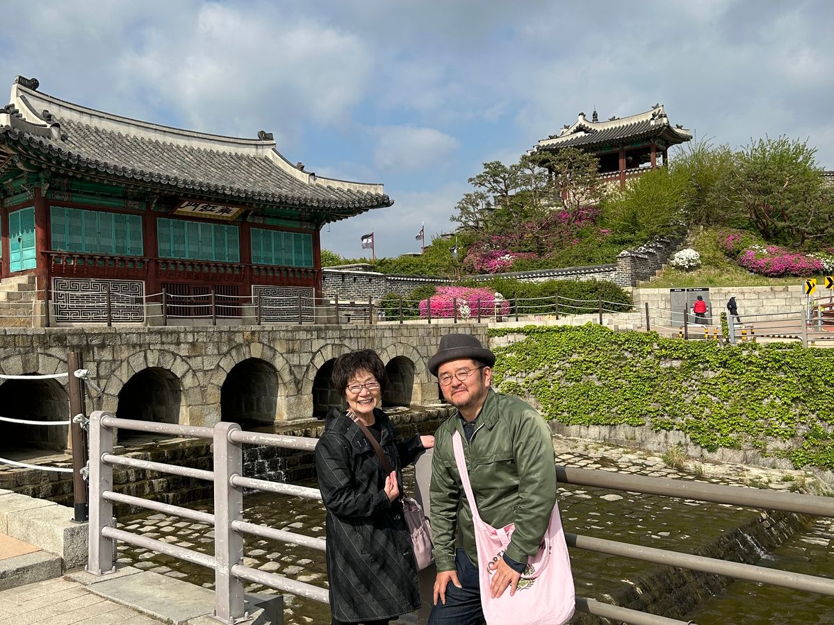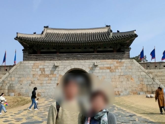 ガイドさんの歴史に関する知識が豊富で親切で日本語もお上手でとても楽しかったそうです。母はイ・サンのファンなのでそのドラマについてもお話しできて嬉しかったようです。写真は水原での撮影スポットで撮影したもので記念の写真になったそうです。