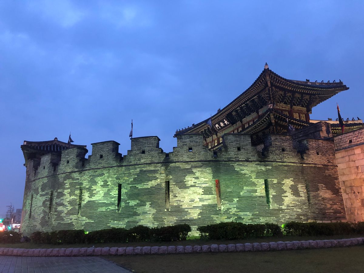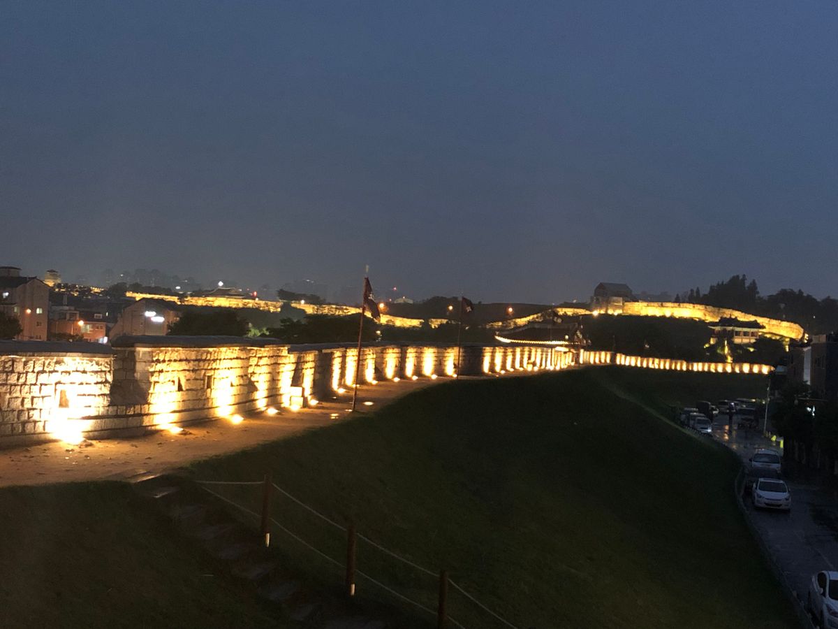 あいにくの雨でしたが、ライトアップされた水原華城は綺麗でした。