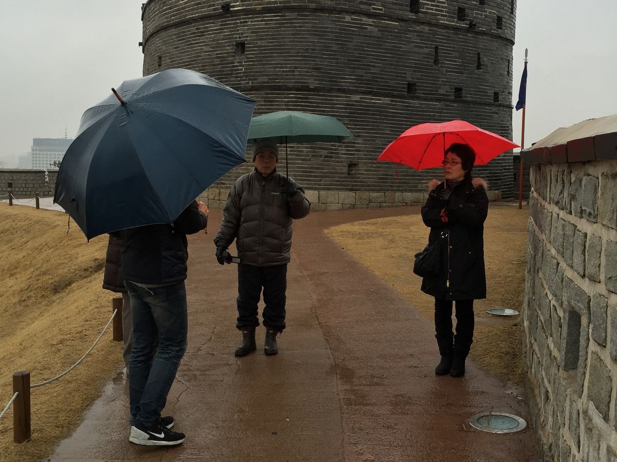 今にも雨が降りそうな日。バス専用レーンを突っ走り、45分ほどで水原に到着。ガイドさんがとても熱心にいろいろと説明して下さいました。本当は新緑の季節が素晴らしいそうで、ちょっと時期が早く寂しい感じでしたが、お城にまつわる歴史をきけて、まさにガイドつきツアーの醍醐味を味わいました。写真もここぞというところで撮ってもらえたし。残念なのは、豚カルビ発祥の地である水原で自由時間がなかったこと。(トイレ休憩はあり)けっこうレトロな町で、お散歩しても面白そうでした。帰りは仁寺洞で解散。日本なら浅草に例えられ、古くからある安いお土産屋さんや筆やさんが多いので、明洞などのショッピングとは違ったお買い物ができました。ちなみに明洞までは、大通りを10分ちょっと南に歩けば行けます。